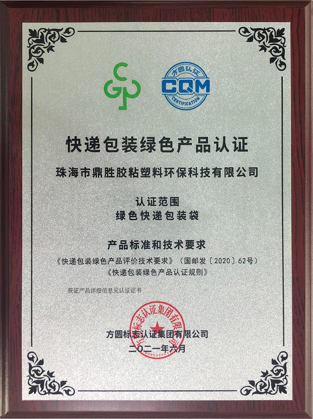 獲國家郵政總局頒發(fā)的:快遞包裝綠色產品認證